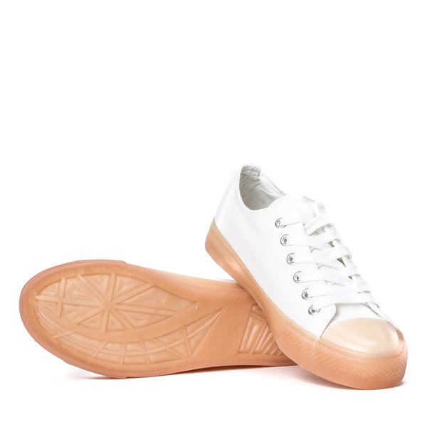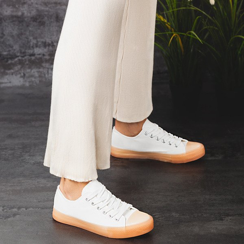 • Stylowe trampki wykonane z tkaniny w kolorze białym. Miękka gumowa podeszwa w kolorze brązowym zapewnia niezwykły komfort noszenia. Świetnie komponują się z każdą stylizacją.