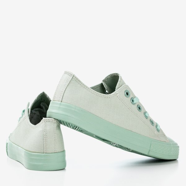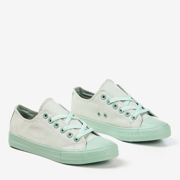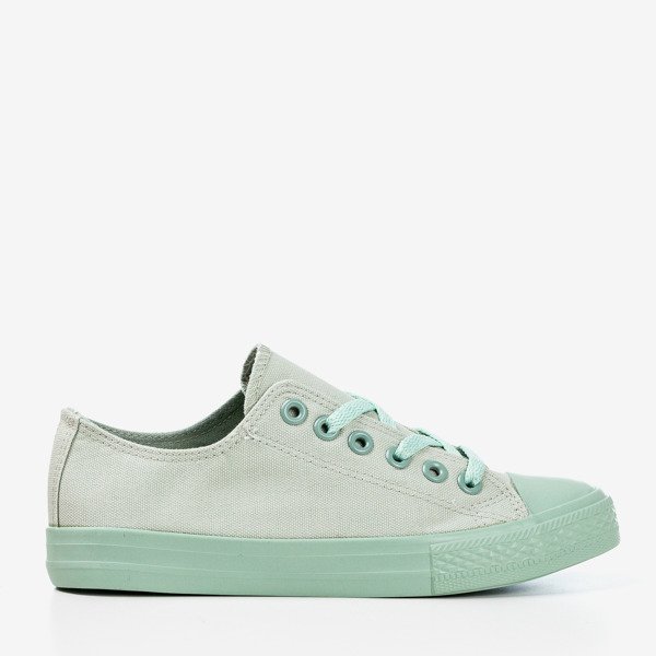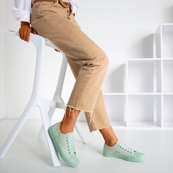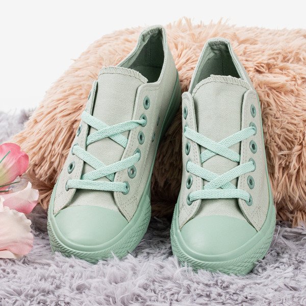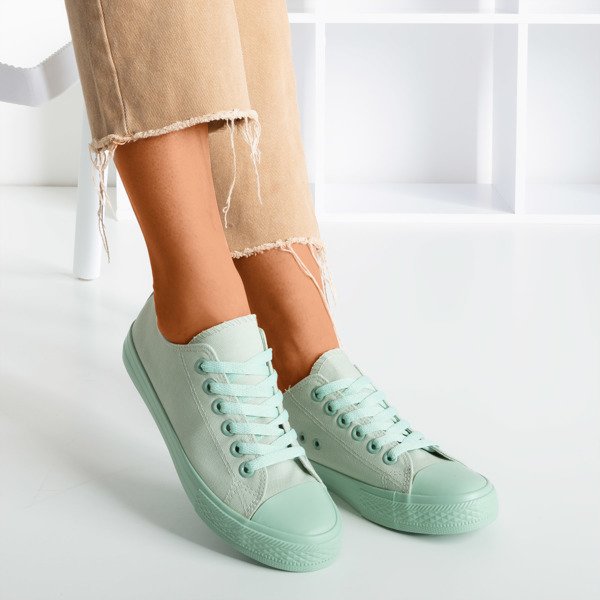 - Trampki damskie w kolorze jasnozielonym wykonane z materiału tkaninowego. Model wiązany sznurówkami. Podeszwa gumowa. Idealne na co dzień.