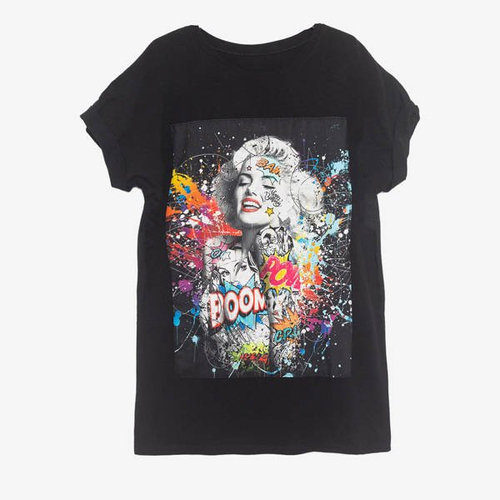 - Czarna damska tunika o prostym kroju, z krótkim podwijanym rękawem. Wykonana z tkaniny bawełnianej. Z przodu model zdobiony naszywką z nadrukiem dziewczyny. UWAGA: Dokładność pomiaru (+/-) 1 cm.