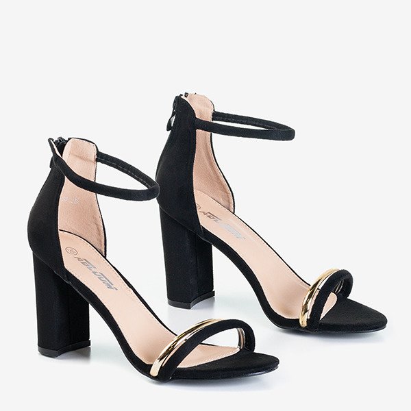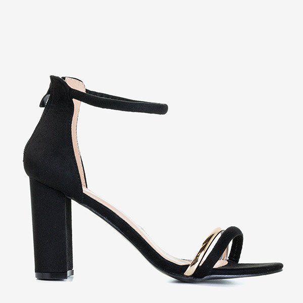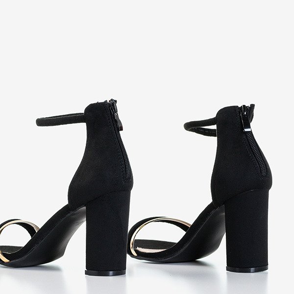 - Eleganckie sandałki damskie na wysokim, stabilnym słupku. Cholewka wykonana z miękkiego zamszu ekologicznego w kolorze czarnym. Przód zdobiony złotym paseczkiem z tworzywa gumowego. W tylnej części zapięcie w formie suwaka.