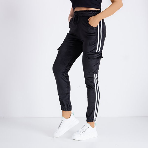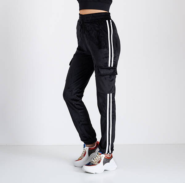 - Spodnie dresowe wykonane z materiału a'la welur. Model posiada: gumkę w pasie i nogawkach oraz 4 kieszenie. Dresy zdobione białymi lampasami po bokach.