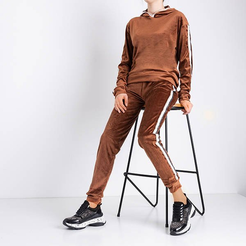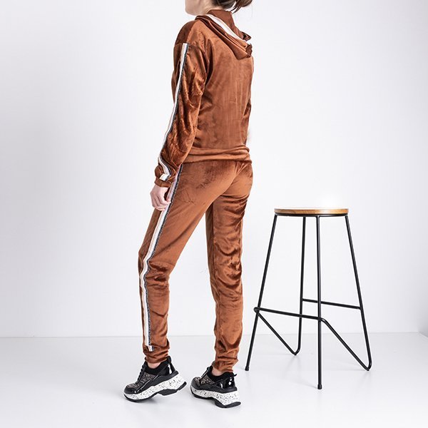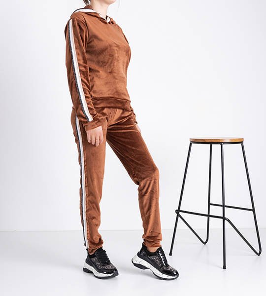 Brązowy damski komplet dresowy z lampasami - Odzież