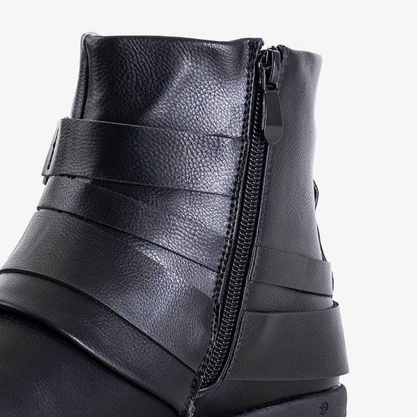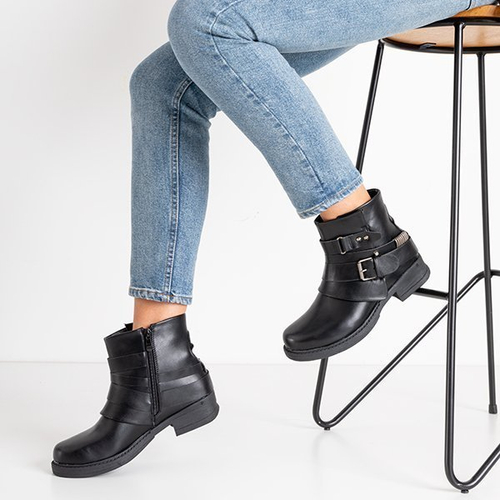 - Klasyczne damskie botki w kolorze czarnym, wykonane ze skóry-eko. Cholewka posiada sprzączkę oraz suwak po boku. W środku ocieplenie w formie futerka.