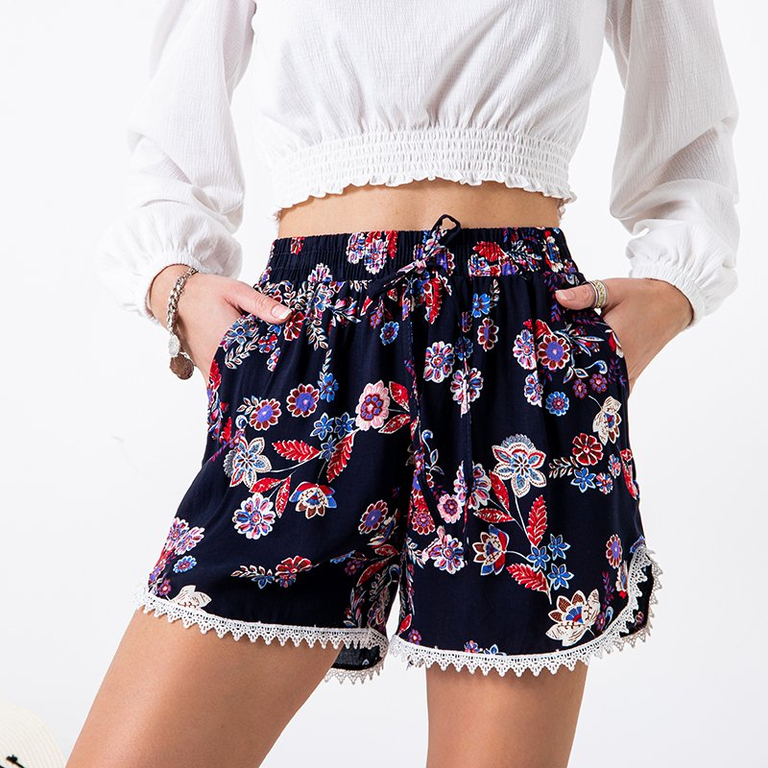 Tamsiai mėlyni moteriški trumpi šortai su raudonomis gėlėmis - Drabužiai
