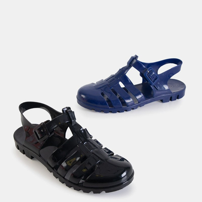 - Juodos spalvos moteriški sandalai, pagaminti iš guminės medžiagos. Modelis su iškirpimais ant nosies, turi sagtį. Puiki avalynė vasaros dienoms!