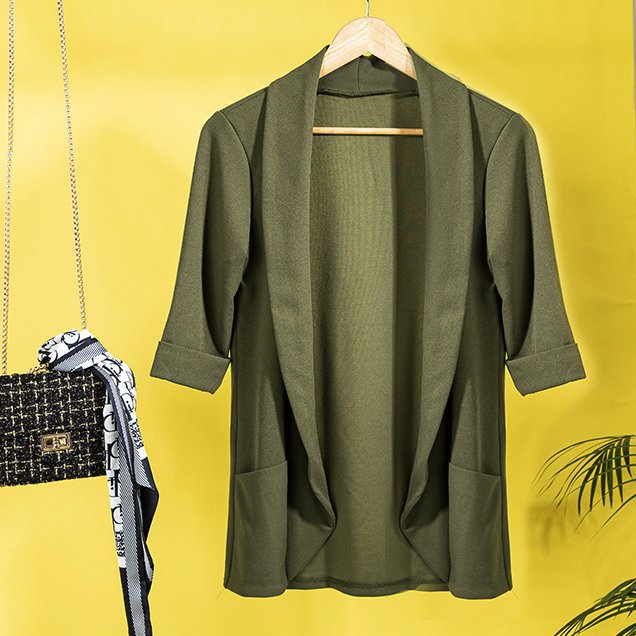 - Stilingas moteriškas apsiaustas iš poliesterio medžiagos. Modelis neturi užsegimo, priekyje - dvi kišenės, 3/4 ilgio rankovės. Puikiai tinka bet kokiam stiliui. PASTABA: Matavimo tikslumas (+/-) 1 cm.