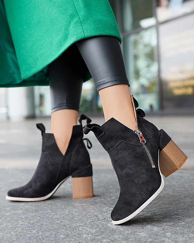 • Išskirtiniai moteriški batai apvalia nosimi. Konstrukcinė medžiaga - eko odos zomša, viduje eko odos vidpadis. Batviršis užsegamas užtrauktuku, šonuose yra iškirptės. Puiki avalynė madingai ir originaliai aprangai kurti!