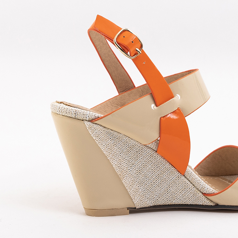 - Elegantiškos pleištinės basutės iš lakuotos eko odos ir austo audinio. Bato vidus padengtas malonia liesti eko oda, vietoje pirštų-austas audinys. Pateikti moteriški batai, išorėje užsegami sagtimi.