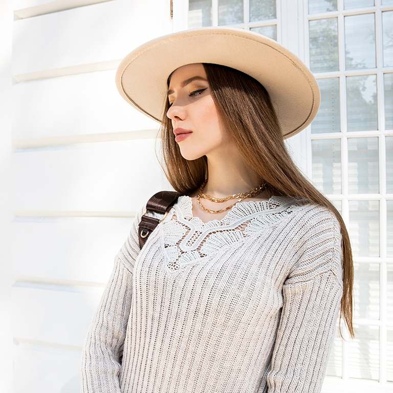 Moteriška smėlio spalvos megztinė suknelė su nėriniais - Apranga