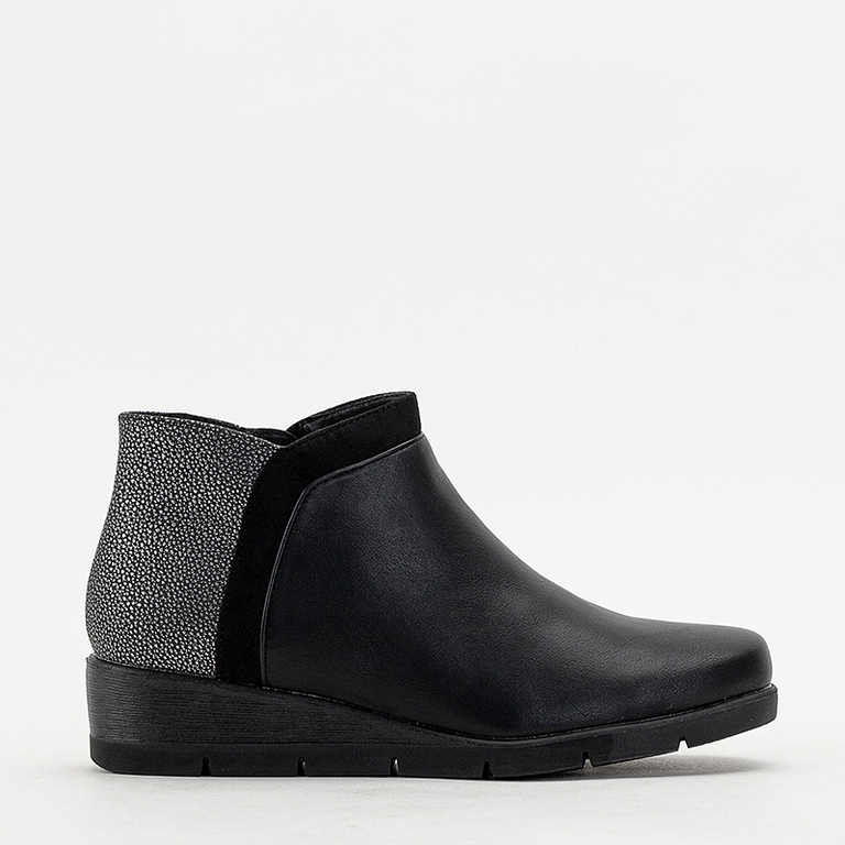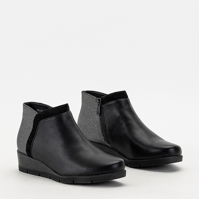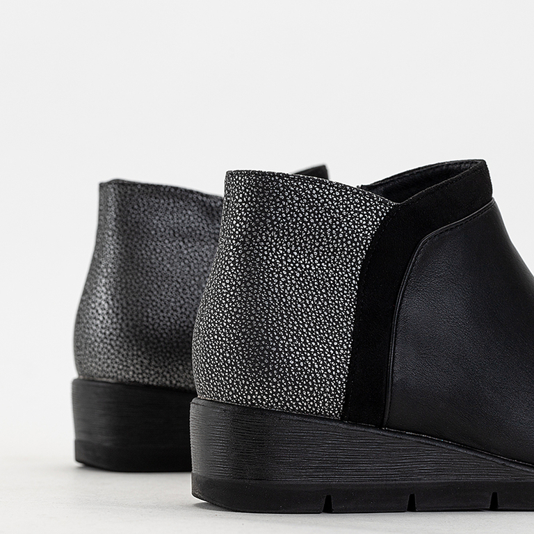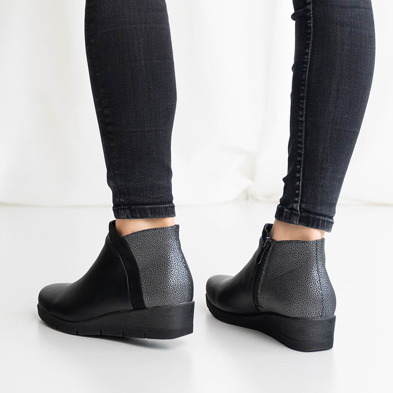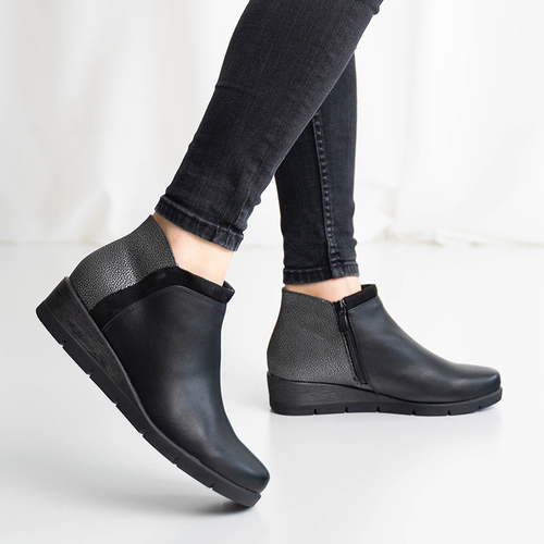 - Puikūs moteriški batai ant žemo pleišto kulno, pagaminti iš ekologiškos odos. Viršus užsegamas užtrauktuku, nugarinėje pusėje yra dekoratyvinis reljefas. Vidpadis pagamintas iš audinio. Patogi avalynė kiekvieną dieną.