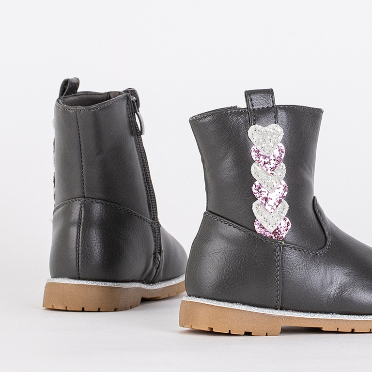 - Mergaičių batai iš ekologiškos odos. Viduje plono porolono ir audinio pamušalas, ties kulkšniu užsegamas užtrauktuku. Puoštas blizgančiomis širdelėmis! PASTABA: prie modelio pado gali būti klijų pėdsakų.