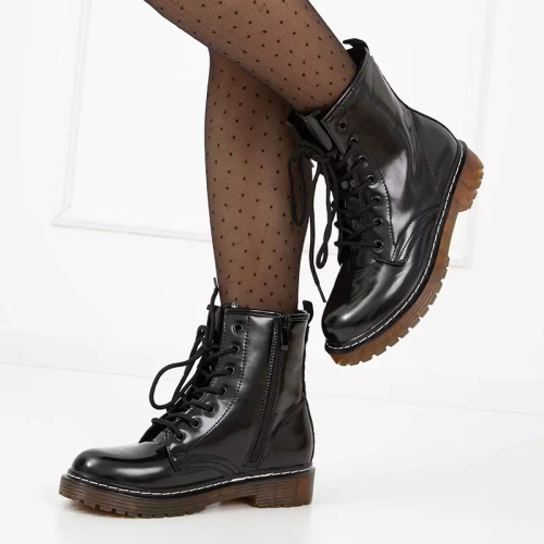 - Moteriški darbiniai batai, pagaminti iš lakinės ekologiškos odos. Modelis suvarstomas ir užsegamas užtrauktuku, per vidurį subtili izoliacija plono putplasčio pavidalu. Pastaba: gaminys turi įbrėžimų ant medžiagos.