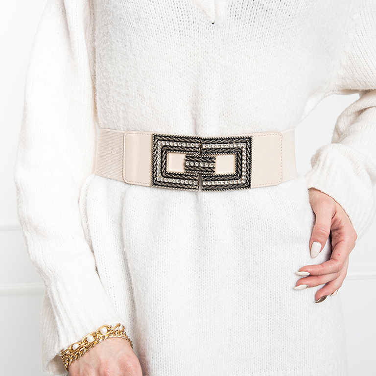 Moteriškas smėlio spalvos tamprus diržas su sidabrine sagtimi su kubiniais cirkoniais - Priedai