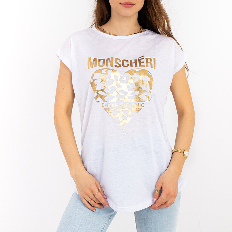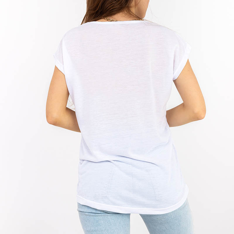 - Moteriški veido marškinėliai trumpomis rankovėmis ir apvalia iškirpte. Priekinė marškinėlių dalis dekoruota aukso spalvos raštu. Puikus pagrindas daugeliui kasdienių įvaizdžių! PASTABA: Matavimo tikslumas (+/-) 1 cm.