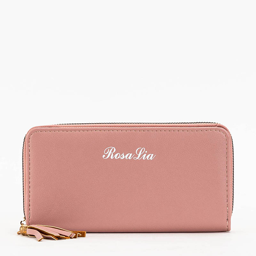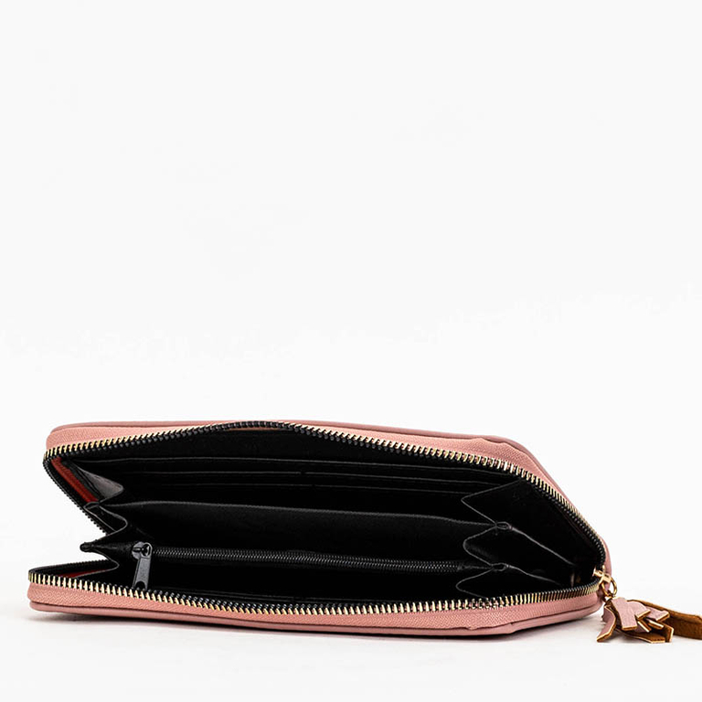 • Moteriška piniginė iš ekologiškos odos su užrašu priekyje ir dekoratyviniu kutu. Prekė užsegama užtrauktuku. Modelis turi: - 4 skyrius, iš jų 1 su užtrauktuku, - 10 kišenių mokėjimo kortelėms ar kitiems dokumentams.