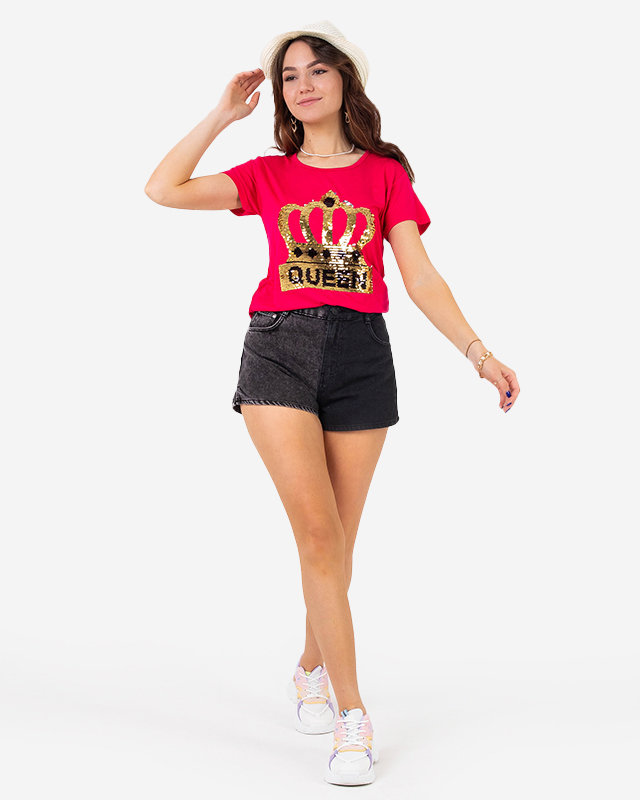 Fuksijos spalvos moteriški marškinėliai su karūna ir blizgučiais – drabužiai