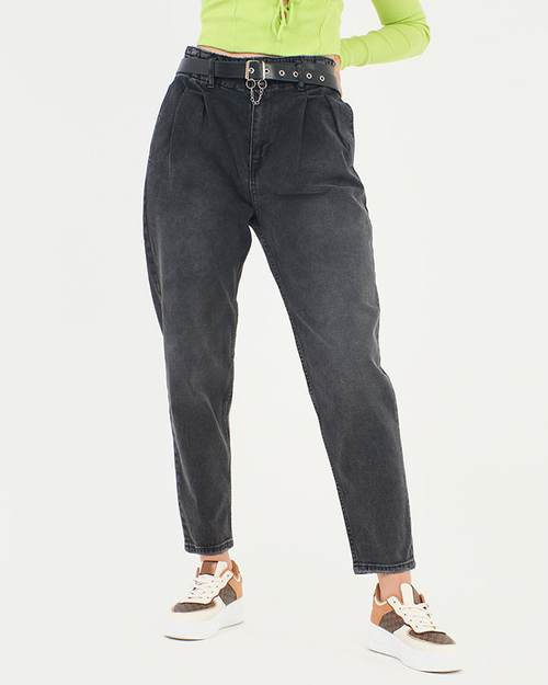 • Stilingi moteriški mom džinsai, pagaminti iš medvilnės medžiagos. Modelis turi: - aukštą juosmenį, - užsegimą sagute ir užtrauktuku, - 4 kišenes, - 100 cm ilgio ir 3 cm pločio diržą PASTABA: Matavimo tikslumas (+/-) 1 cm.