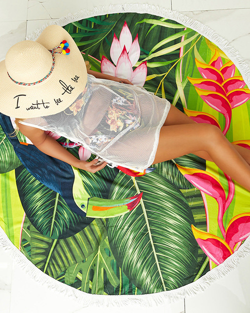 • Didelis apvalus paplūdimio rankšluostis iš lygaus, malonaus liesti, minkšto audinio. 155 cm skersmens gaminys dekoruotas spalvingu raštu. Turiu įdėti jį į tavo lagaminą, kai atostogauji! PASTABA: Matavimo tikslumas (+/-) 1 cm.