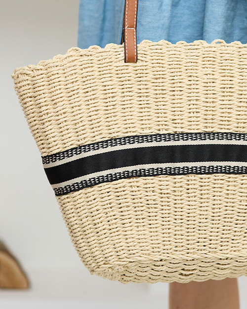- Didelė moteriška rankinė iš austo popierinio šiaudelio. Modelis užsegamas užtrauktuku, viduje yra 1 pagrindinis skyrius ir slydimo kišenė. Dekoruota juoda audinio juostele šone. Puikus paplūdimio stiliaus priedas!
