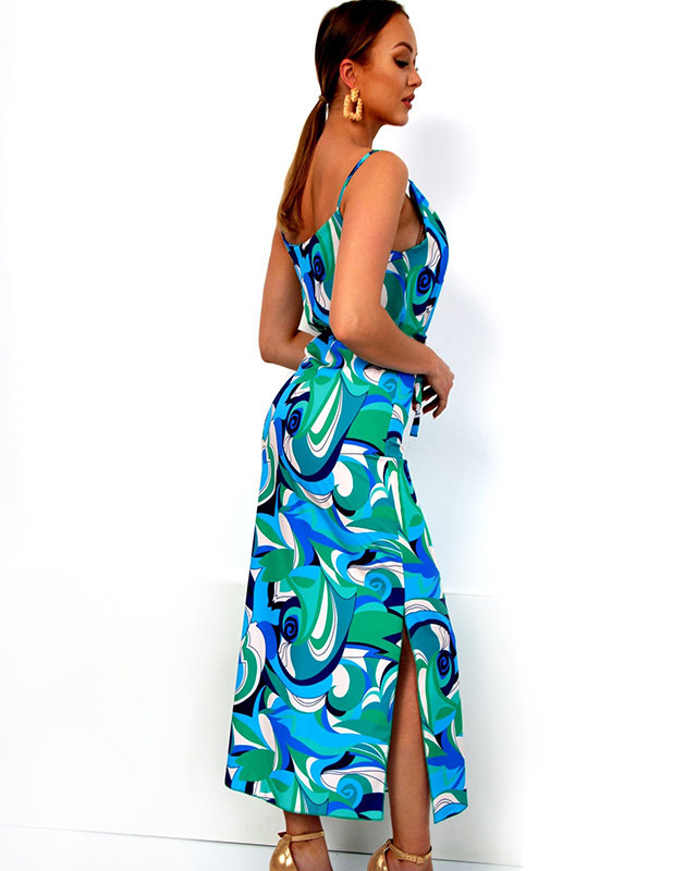 - Paprasta moteriška maksi suknelė su įdomiu raštu, pasiūta iš plono, lengvo audinio. Modelis su petnešėlėmis su apvalia iškirpte. Turi papildomą dirželį ties juosmeniu. PASTABA: Matavimo tikslumas (+/-) 1 cm.