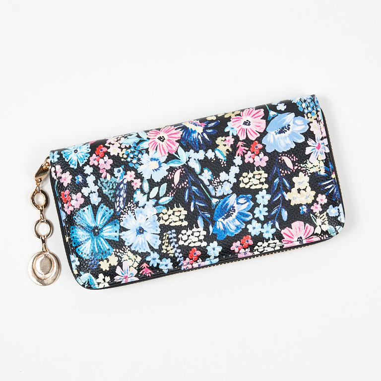 - Gėlėta moteriška piniginė iš ekologiškos odos, užsegama užtrauktuku. Modelis turi: - 2 skyrelius, tarp kurių 1 užtrauktuku užsegama kišenė monetoms, - 10 kišenių mokėjimo kortelėms ar kitiems dokumentams.