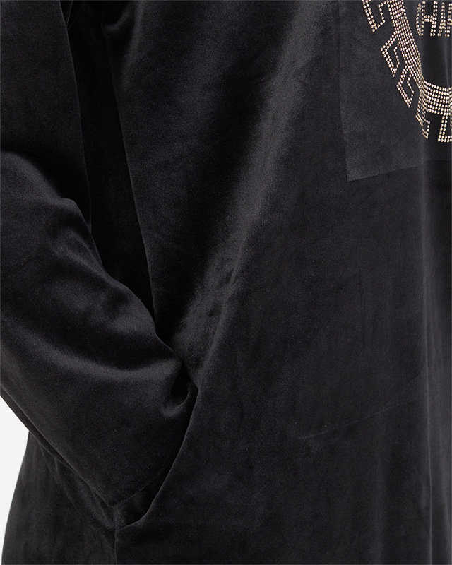- Stilinga ilga tunika moterims, pasiūta iš minkšto audinio a'la veliūro. Gaminys dekoruotas kubiniu cirkoniu, turi ilgas rankoves ir dvi slydimo kišenes. Būtina turėti kiekvienos moters garderobe! PASTABA: Matavimo tikslumas (+/-) 1 cm.