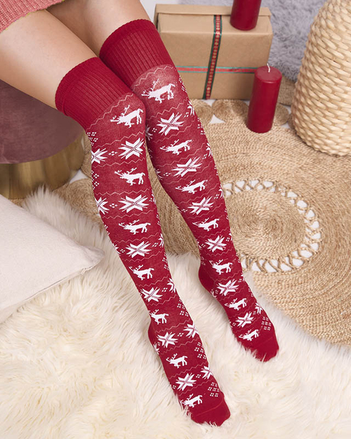• Puošnios moteriškos kojinės virš kelių, pasiūtos iš elastingo medvilninio audinio su kalėdiniu raštu. Šiltos ir patogios - tai puikus dovanų variantas!