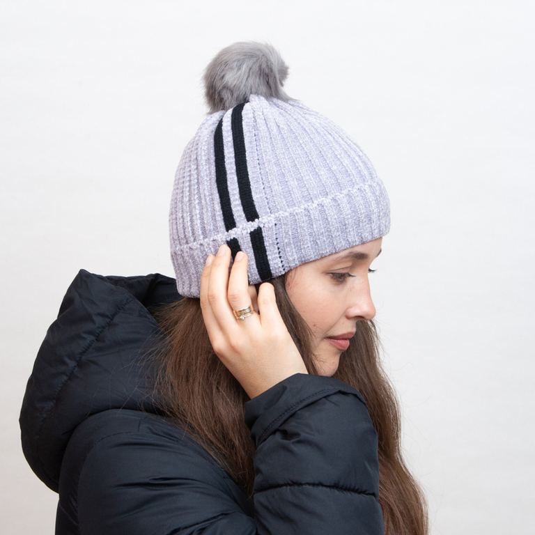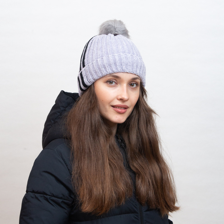 Pilka apšiltinta kepurė su baltomis juostelėmis ir pomponu - Aksesuarai