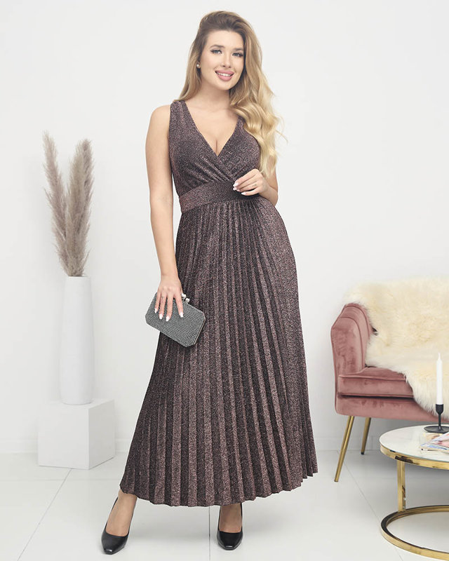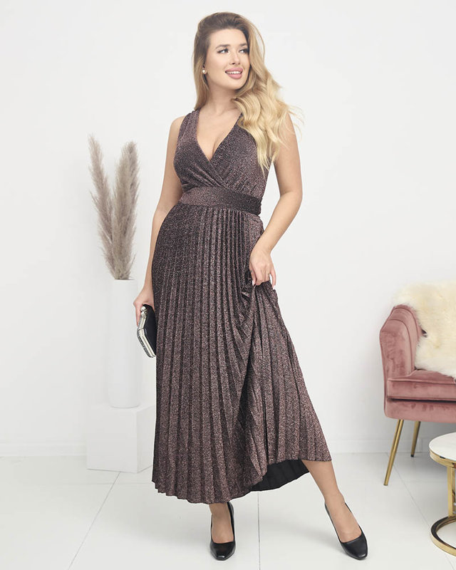 - Vakarinė ilga moteriška suknelė, pagaminta iš medžiagos su blizgančiais siūlais. Modelis yra be petnešėlių, turi saldžią iškirptę ir elastingą liemenį. Suknelės apačia klostuota. Puikiai tinka ypatingoms progoms!