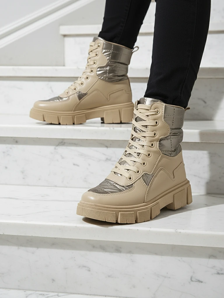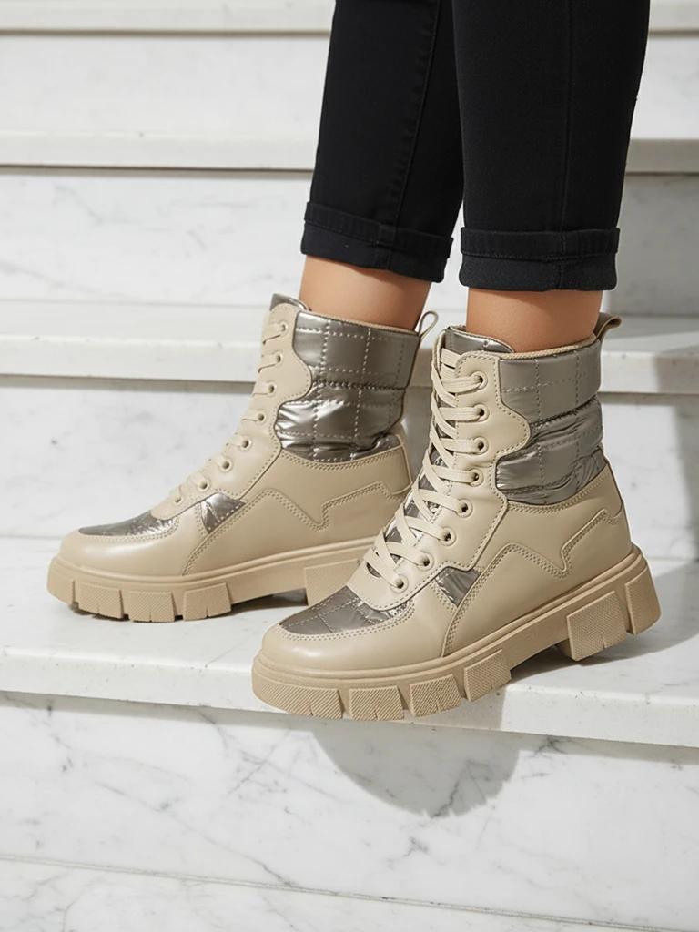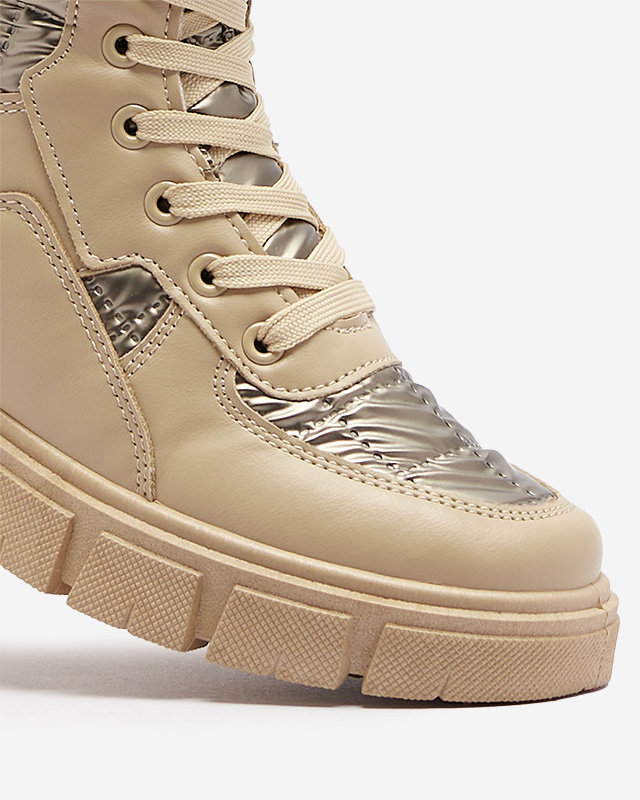 - Puikūs moteriški aulinukai a'la workeriai su raišteliais. Viršutinė dalis pagaminta iš ekologiškos odos ir dirbtinės medžiagos a'la vaškuota drobė su dygsniuota apdaila. Vidus išklotas audiniu.