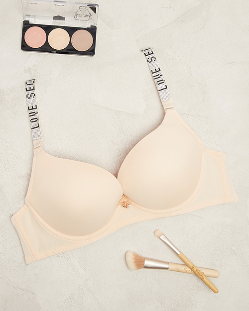 - Moteriška vienspalvė liemenėlė su paminkštinimais. Modelis nugaroje užsegamas kabliukais, petnešėlės dekoruotos cirkonais, jos nuimamos ir reguliuojamo ilgio. Be to, gaminys yra su klasikinėmis petnešėlėmis.
