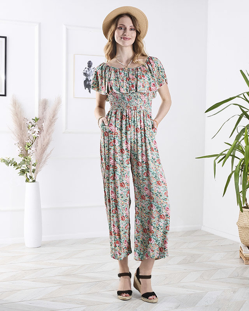 Žalios-rožinės spalvos ilgas gėlių rašto moteriškas kombinezonas - Apranga