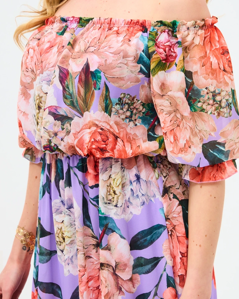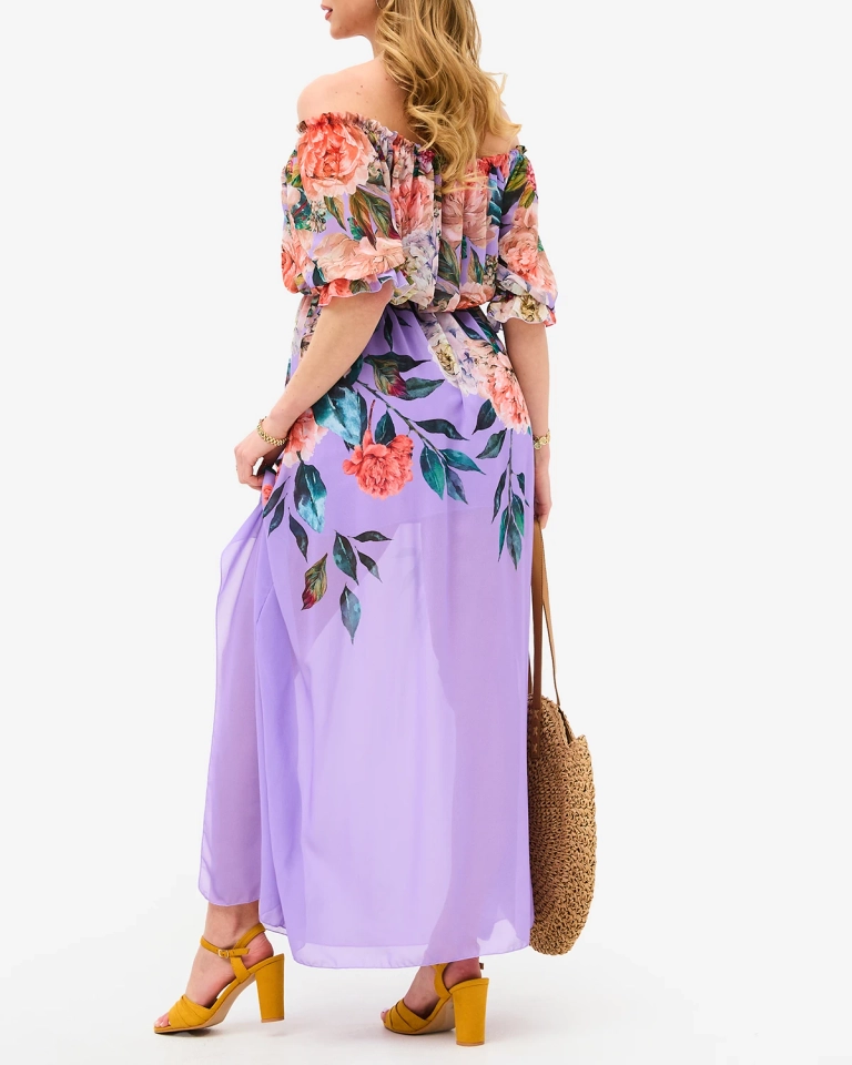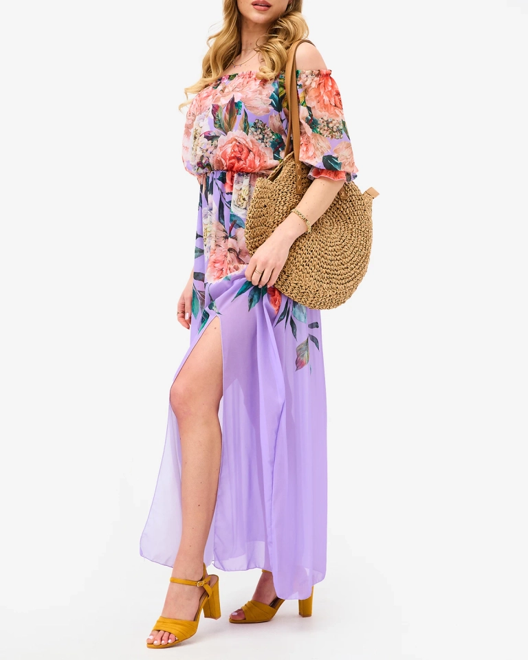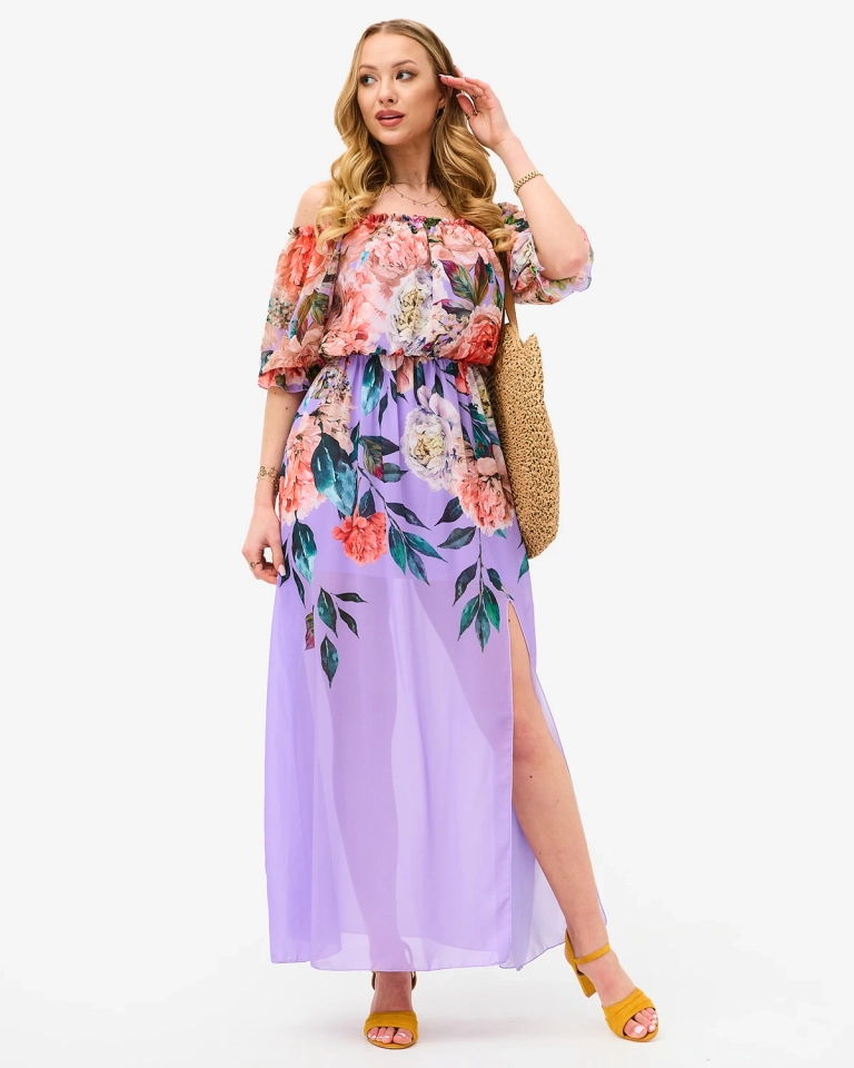 Violetinė moteriška ilga suknelė su gėlėmis ir pamušalu - Apranga