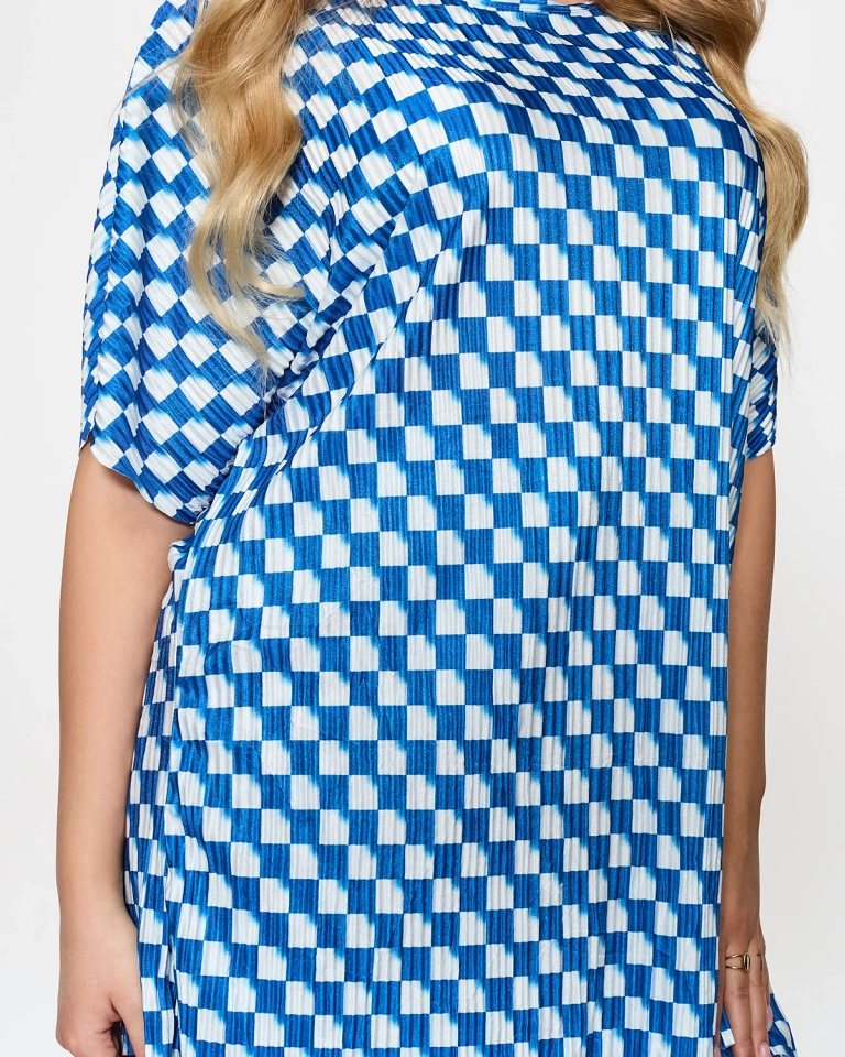 - Moteriškas raštuotas komplektas, pasiūtas iš slidžios languotos medžiagos. Palaidinė su apvalia iškirpte yra trumpomis rankovėmis. Palazzo kelnės su plačiu pasididžiavimu vietoje liemens ir dekoratyviniais raiščiais. PASTABA: matavimo tikslumas (+/-) 1 cm
