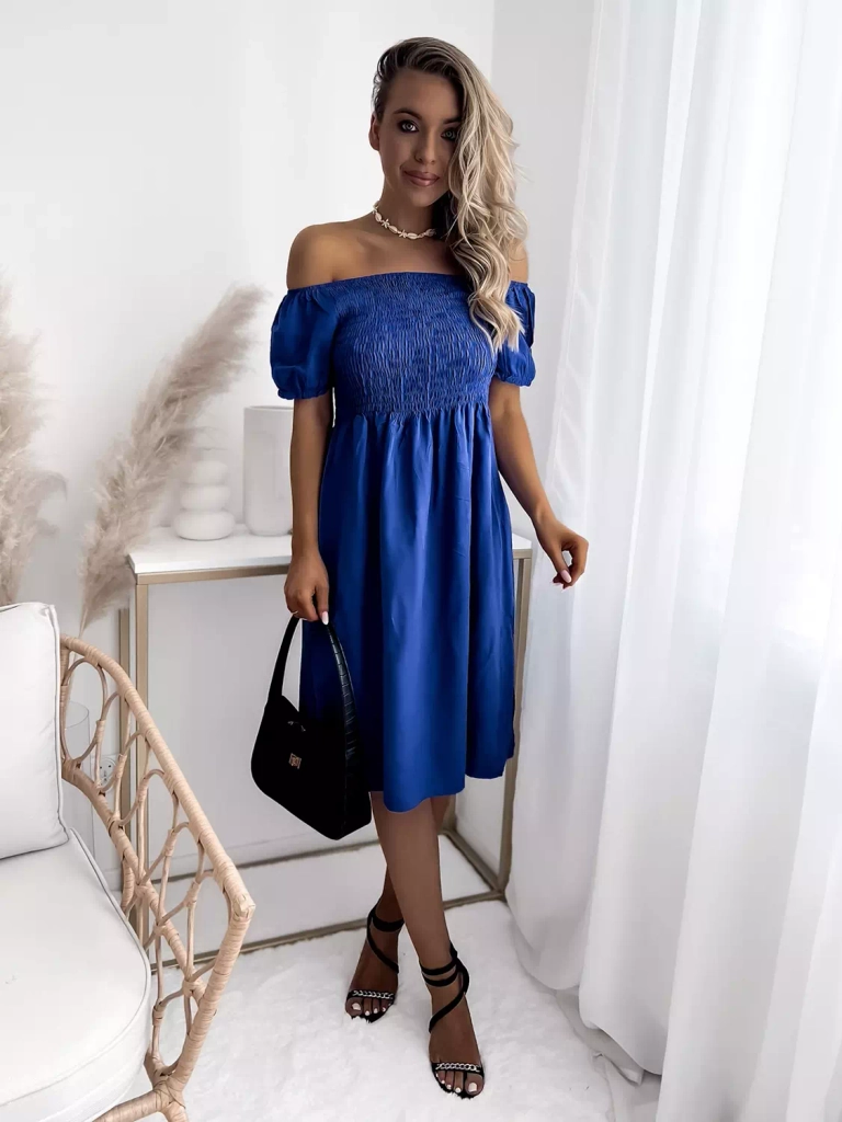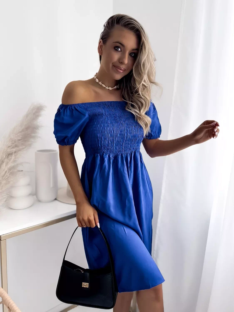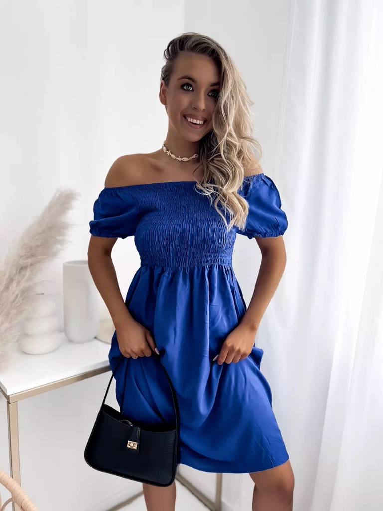- Švelni moteriška mini ilgio suknelė iš viskozės audinio. Modelis su ispaniška iškirpte, ties pečiais ir liemeniu - elastinga guma. Suknelė trumpomis rankovėmis. Idealiai tinka atostogoms! PASTABA: matavimo tikslumas (+/-) 1 cm.