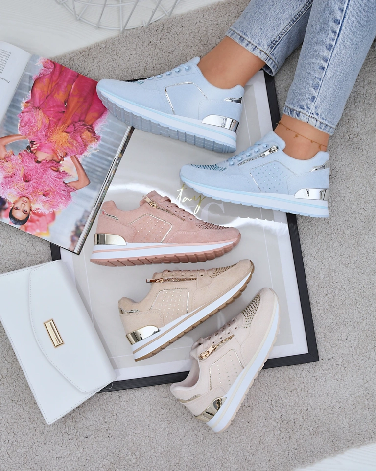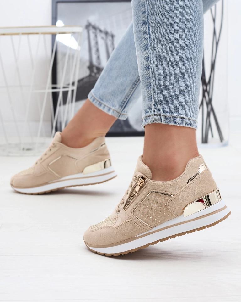 - Stilingi moteriški sportiniai bateliai, pagaminti iš natūralios zomšos odos, su metaliniais intarpais. Viršutinė dalis su raišteliais, puošta cirkonais, šone - dekoratyvinis užtrauktukas, vidpadis - medžiaginis. Super aksesuaras prie mamos džinsų ir džemp