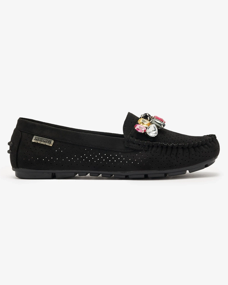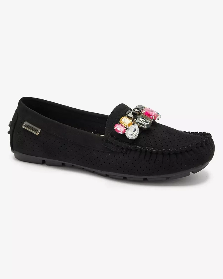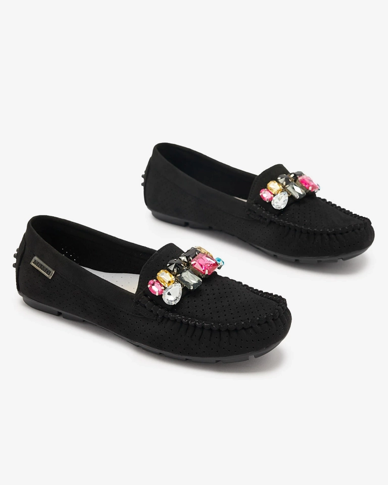 Juodi moteriški ažūriniai mokasinai su spalvingu dekoru Aqitic - Avalynė