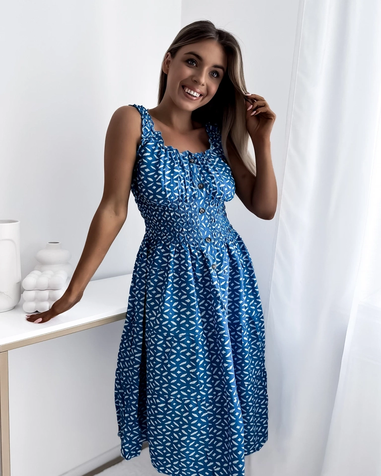 Mėlyna moteriška suknelė iki kelių su raštu- Apranga