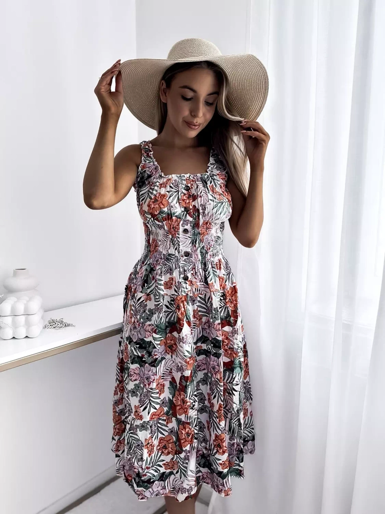 - Moteriška vasarinė suknelė iki kelių, pasiūta iš lengvo audinio su gėlių raštu. Modelis su apvalia iškirpte ir liemens pločio guma. Modelis be petnešėlių. Puikiai tinka atostogoms! PASTABA: matavimo tikslumas (+/-) 1 cm.