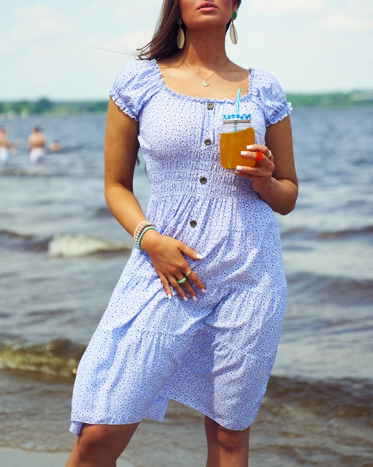 - Moteriška trumpa suknelė su piešiniais, pasiūta iš medvilninio audinio. Modelis su apvalia iškirpte a'la ispanka ir guma liemens plotyje. Modelis trumpomis rankovėmis. Tinka tiek prie sandalų, tiek prie sportbačių! PASTABA: matavimų tikslumas (+/-) 1 cm.