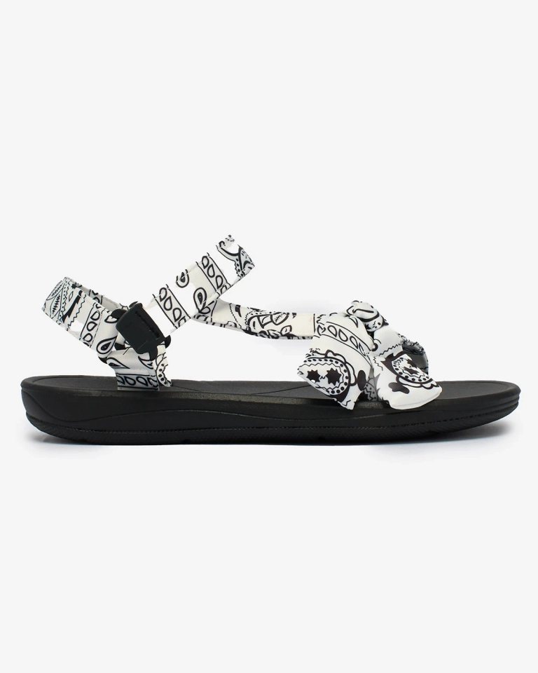 - Sportiniai moteriški sandalai guminiu padu. Dirželiai pagaminti iš audinio medžiagos su raštu ir papuošti lankeliu. Pristatomi moteriški batai užsegami velcro dirželiais. Jie gerai priglunda prie kojos!