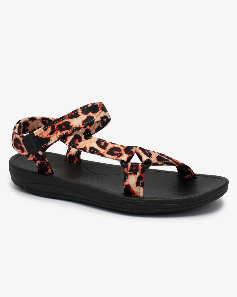 - Moteriški sandalai iš medžiaginio audinio, dekoruoti leopardo raštu. Patogus plokščias, guminis padas. Avalynė užsegama velcro dirželiais. Puikiai tinka dėvėti kasdien!
