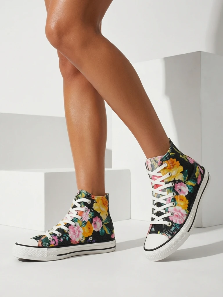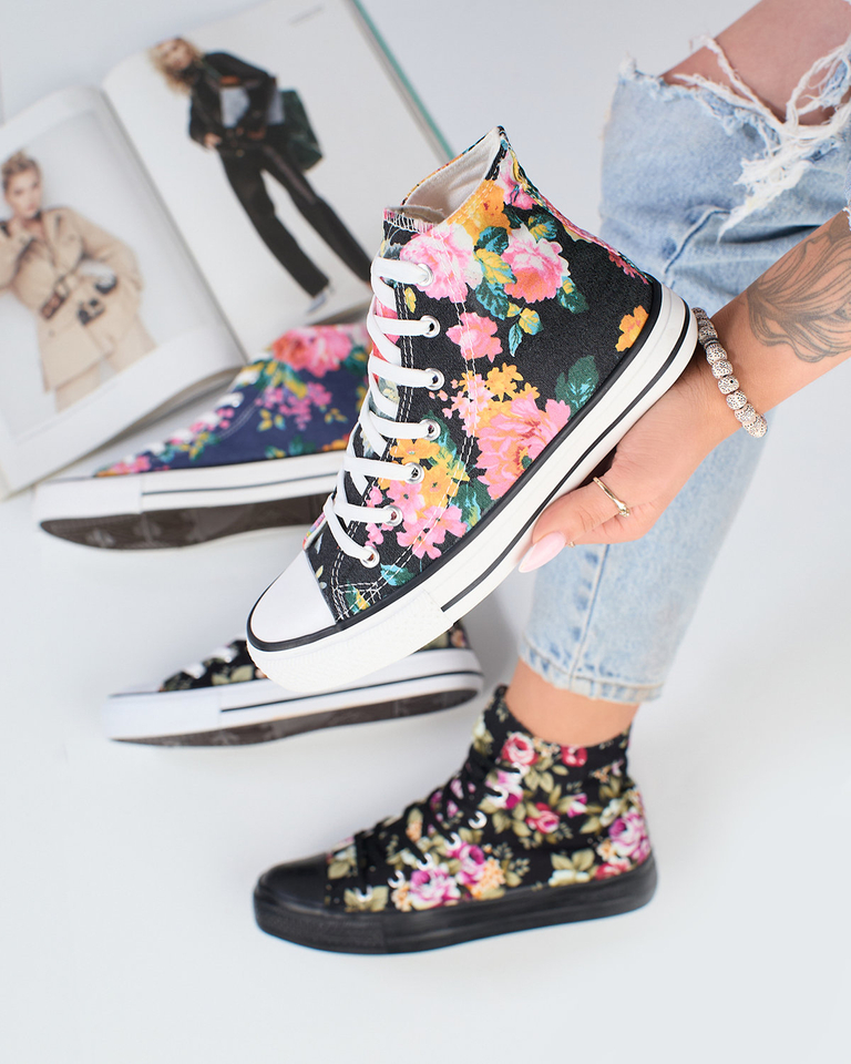 - Moteriški aukšti sportbačiai, pagaminti iš medžiaginio audinio ant guminio pado. Užsisegami raišteliais, jie puikiai priglunda. Papuošti gėlių raštu, jie suteikia žavesio ir vasariško charakterio. Puikiai tinka kasdieniam stiliui!