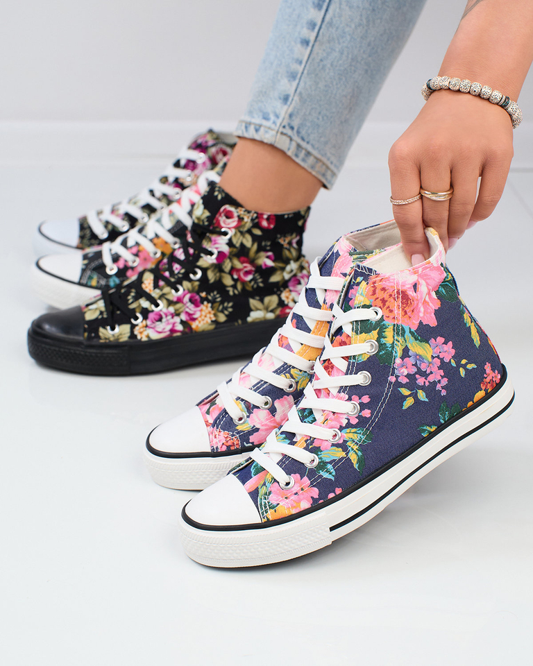 - Moteriški aukšti sportbačiai, pagaminti iš medžiaginio audinio ant guminio pado. Užsisegami raišteliais, jie puikiai priglunda. Papuošti gėlių raštu, jie suteikia žavesio ir vasariško charakterio. Puikiai tinka kasdieniam stiliui!