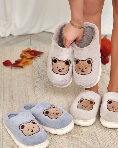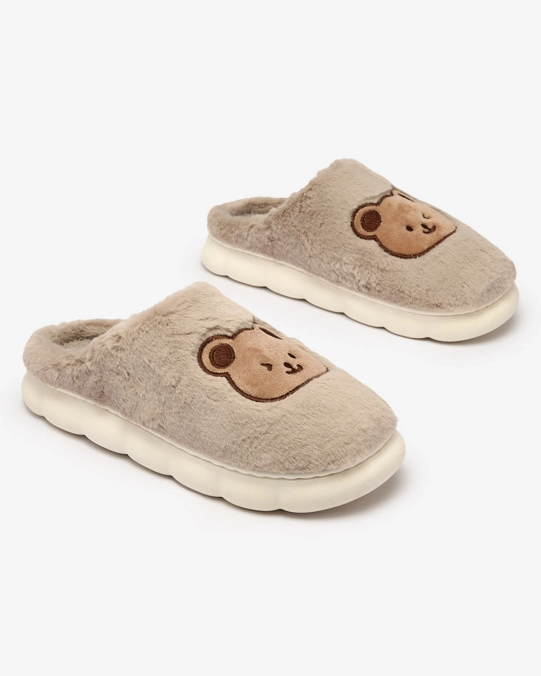 - Unikalios moteriškos šlepetės plokščiu padu, dekoruotos meškiuko lopu. Modelis pagamintas iš kailį imituojančios medžiagos. Puikus pasirinkimas namų aprangai!