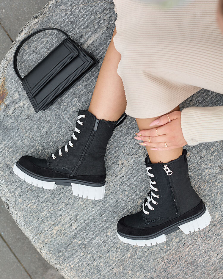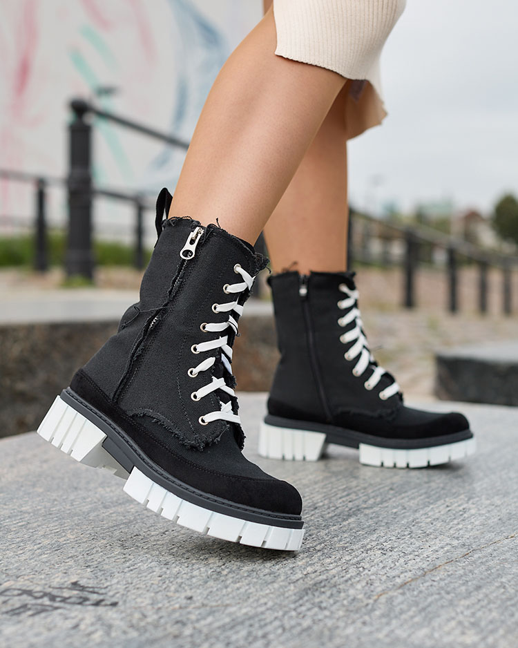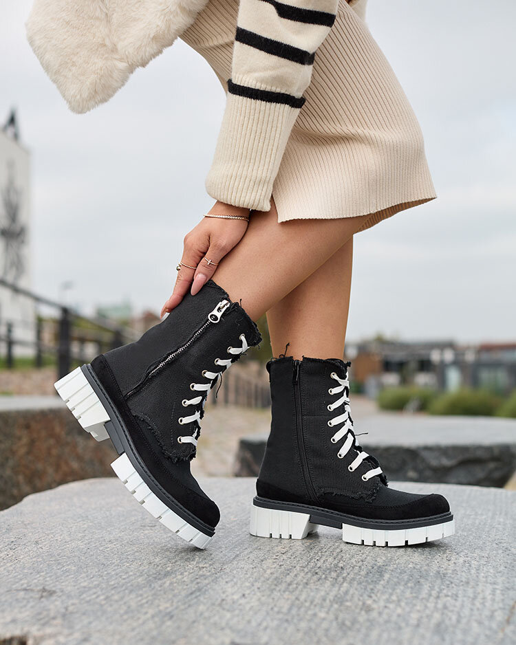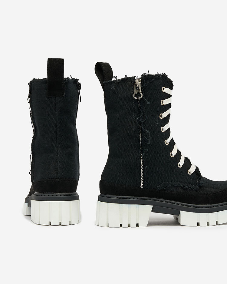 • Moteriški batai iš medžiaginio audinio. Viduje yra subtilus pašiltinimas kailio pavidalu. Nėriniuotas ir užtrauktuku užsegamas modelis, padas guminis. Super priedas prie jūsų rudeninės aprangos!