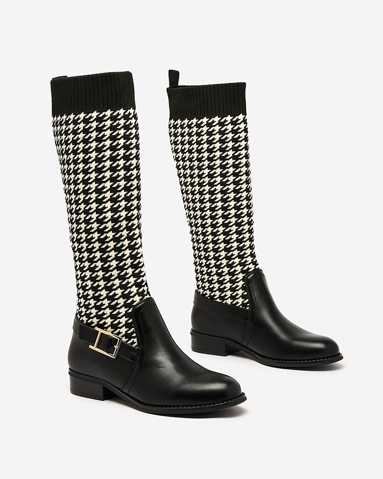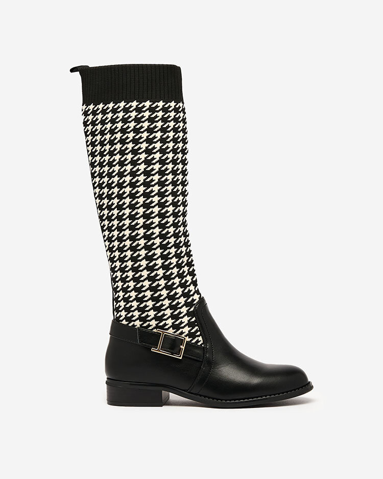 - Moteriški aukštakulniai, pagaminti iš eko odos ir elastingo audinio derinio. Svarstomas modelis, dekoruotas pepitiniu raštu, viduje apšiltintas vidpadžiu a'la kailis. Plokščias kulnas suteikia komforto ir patogumo. Puikus pasirinkimas rudeniui!