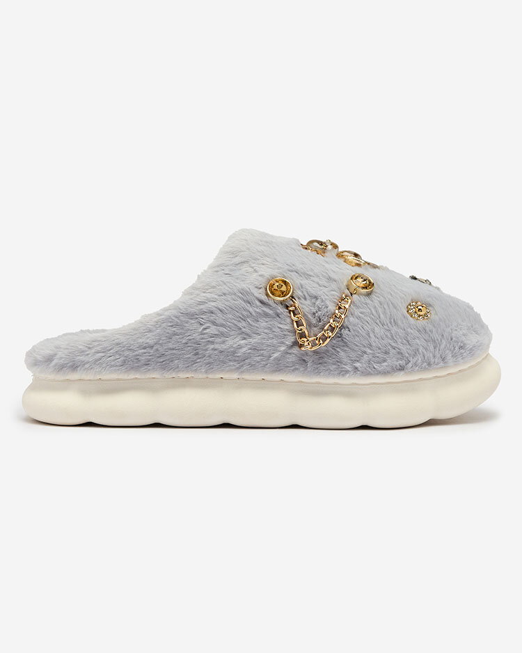 • Sensacingos moteriškos šlepetės plokščiu padu, dekoruotos grandinėlėmis ir plastikiniais meškiuko formos papuošalais. Modelis pagamintas iš kailį imituojančios medžiagos. Puikus pasirinkimas namų aprangai!
