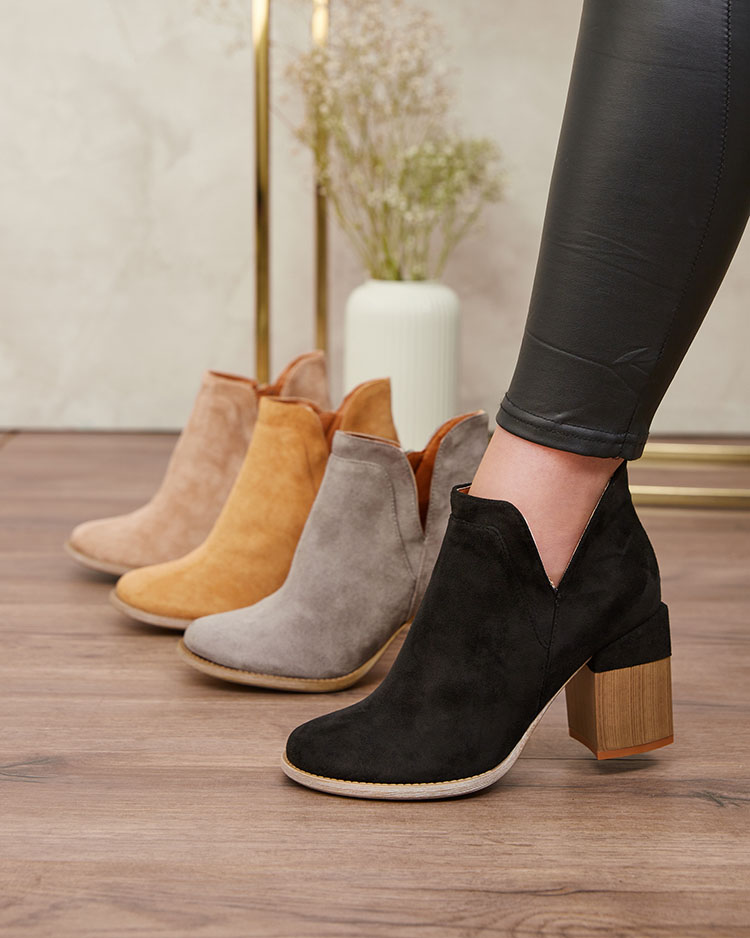 - Stilingi moteriški batai iš ekologiškos zomšos puikiai tinka šaltesnėms dienoms. Batų viršus užsegamas užtrauktuku, viduje - kailis. Modelis ant aukštesnio aulo ir su apvalia nosimi. Super priedas prie laisvalaikio aprangos!