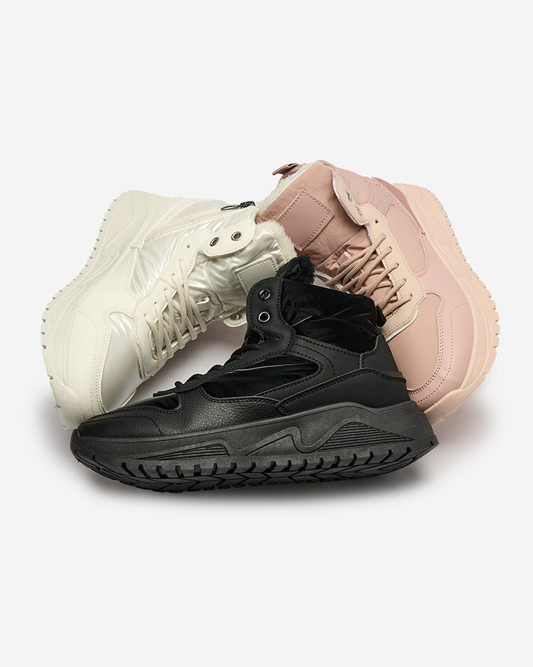 • sportiniai moteriški sportbačiai su storesniu padu. Laisvalaikio batų viršus pagamintas iš ekologiškos odos ir lygios medžiagos. Viduje visiškai pamušti kailiu. Puikiai tinka sportiniams drabužiams!